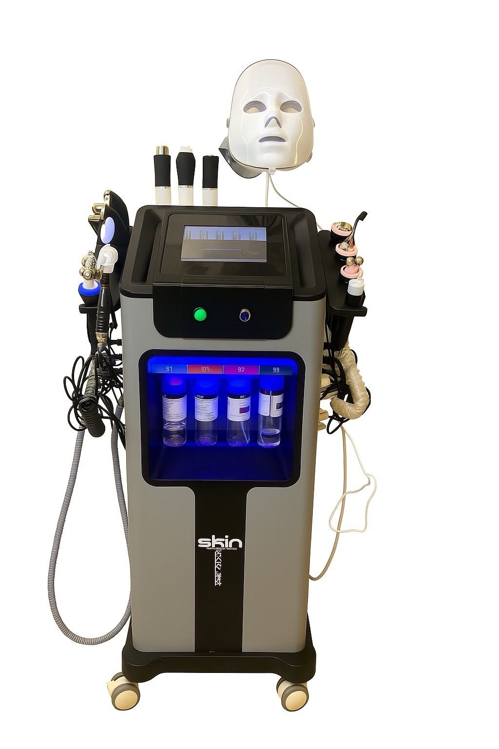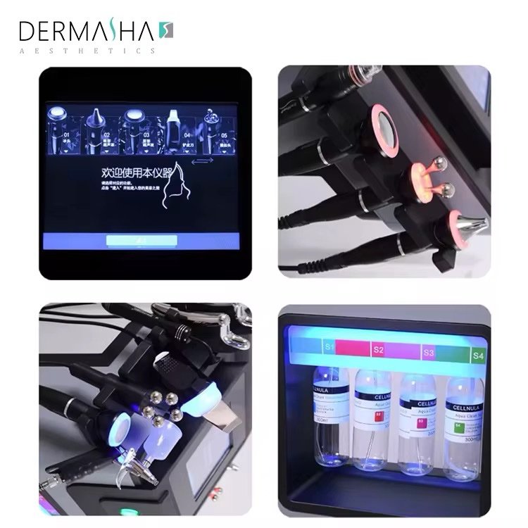 الجهاز يجمع بين التنظيف العميق، التقشير، الشد، الترطيب، ضخ الأكسجين، العلاج الضوئي، وتجديد الخلايا — مما يجعله الاختيار الأمثل للعيادات والبيوتي سنتر الباحثين عن نتائج قوية وفورية.